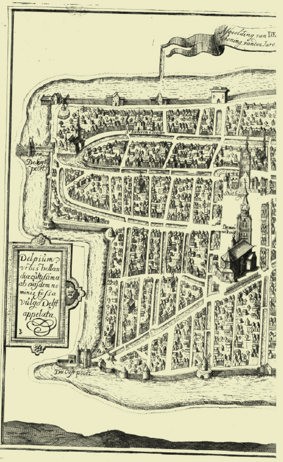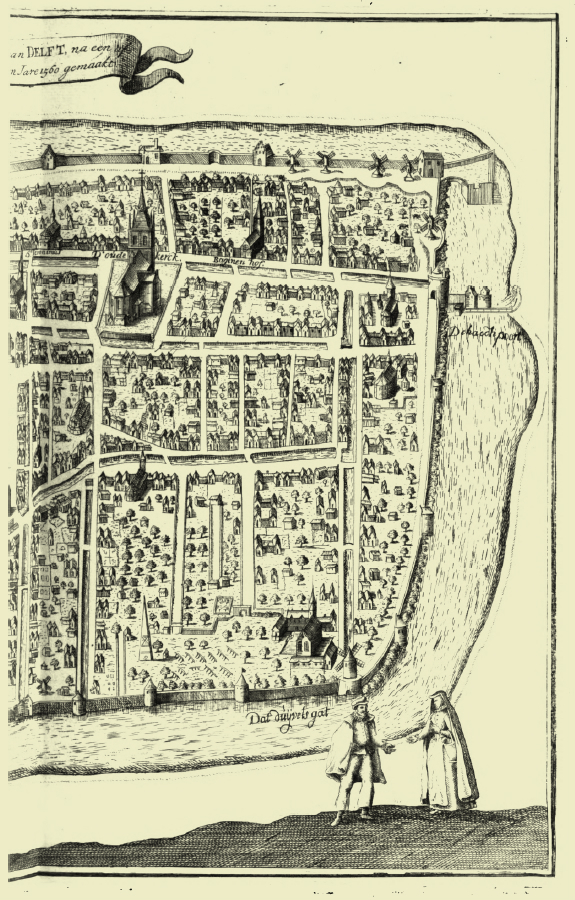 View of Delft from the top of the full wall version of the Kaart Figuratief. This profile and the two churches on either side were drawn by Johan Verkolje, the same painter who did the Leeuwenhoek portraits a couple of years later. The Waterslootse Poort in the center has a fully developed rampart. The bridge led to the Buitenwatersloot, Delft's first housing development outside the walls. In the bottom right corner is the north end of the city lumber yard. The city walls are covered with hawthorn bushes and their nasty thorns. |