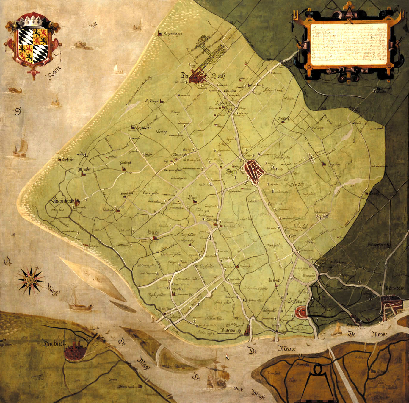 1606This map of Westland shows Delft's relationship to Rotterdam to the south and the larger Den Haag to the north. Note the canals connecting the cities, which enabled the free flow of people and thus labor, capital, and ideas, throughout the country. |