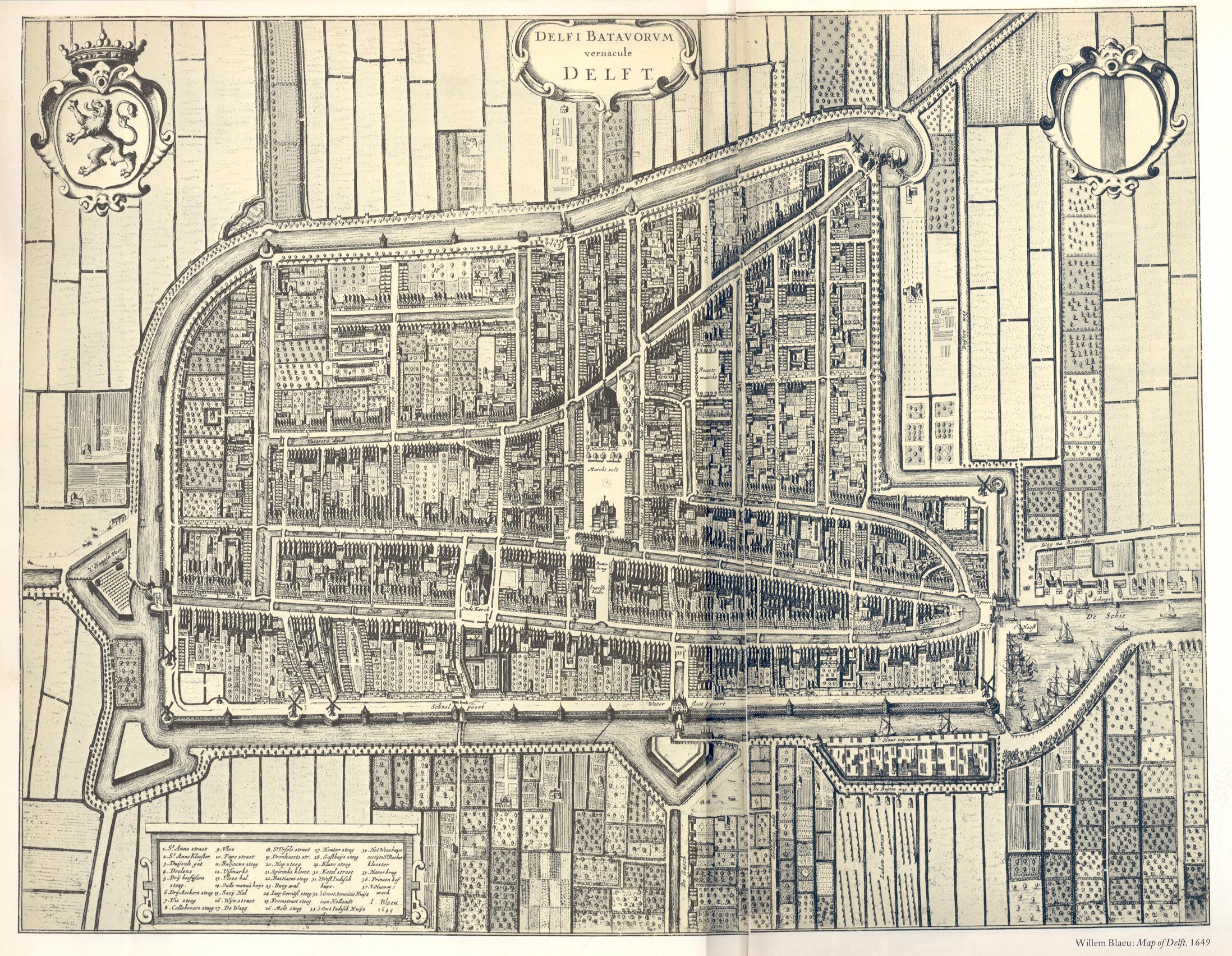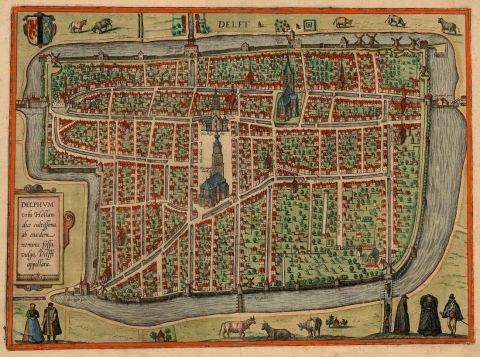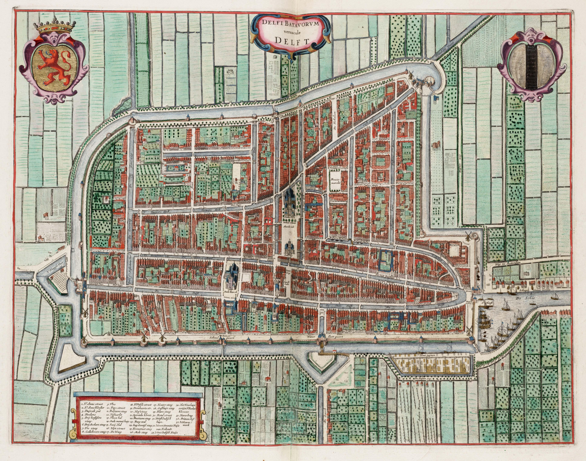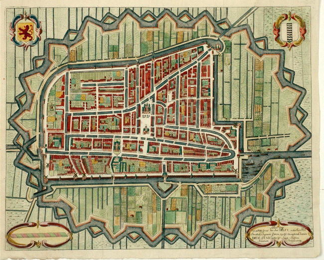 1659Engraved map of Delft by Jan Peeters for Matthäus Merian's Topographia Germaniae Inferioris. It emphasizes the grachten (city canals). |