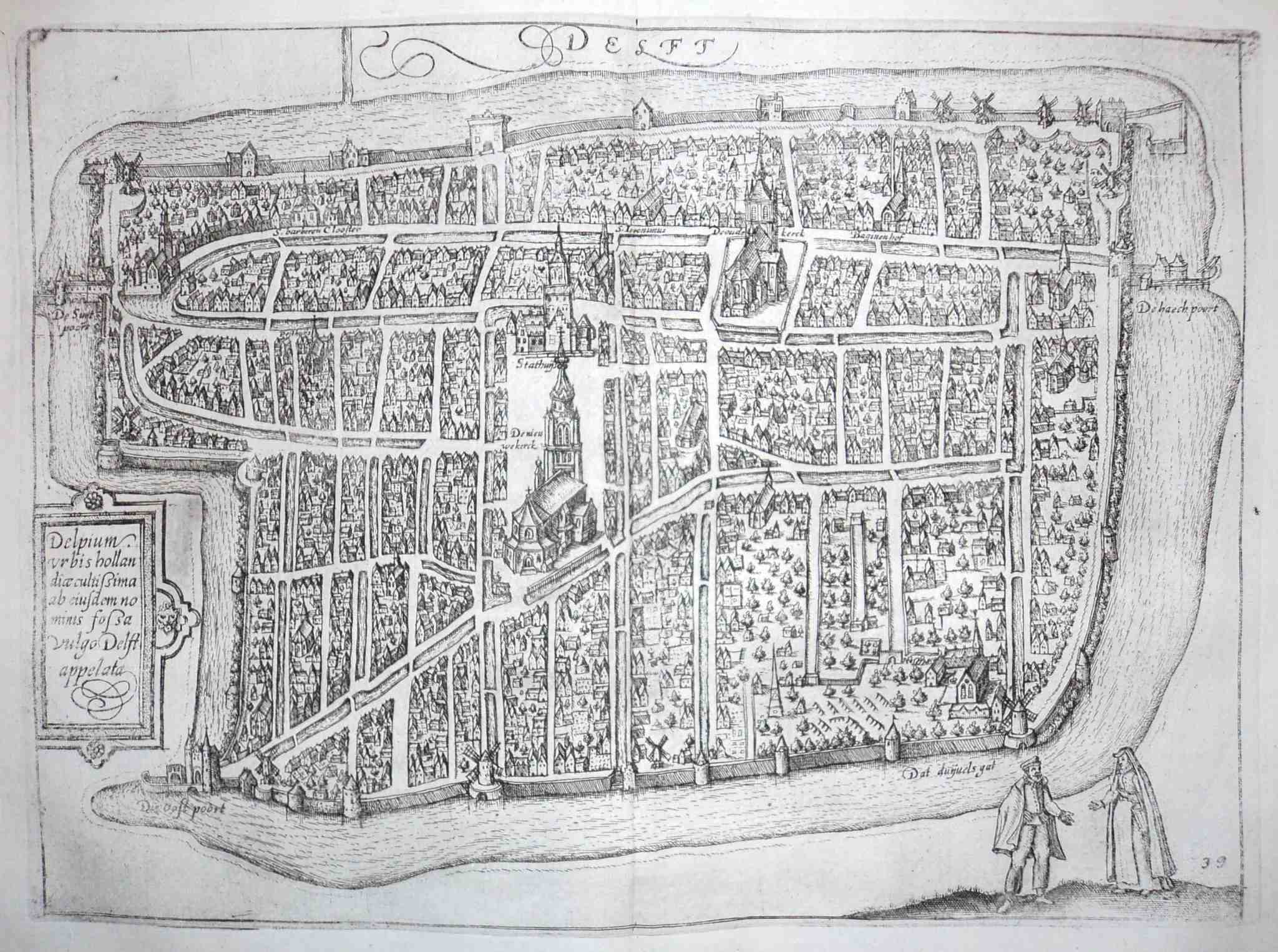 1580This map, in several versions, has been attributed to several people between the late 1500's and the mid-1600's. The earliest attribution is to Lodovico Guicciardini (1521–1589), which would mean that it was made somewhere around 1580. A copperplate version was engraved by Pieter van den Keere (Petrus Kaerius, 1571 - c 1646). This particular version is from Civitates Orbis Terrarum, a six-volume city atlas with 546 maps and illustrations published by Frans Hogenberg and Georg Braun in Cologne between 1572 and 1617. While it is clearly based on the earlier maps with what look like single gates at either end of the Oude Delft gracht, this is the first map with the Schoolpoort and bridge and with a bridge (but no rampart yet) for the Waterslootse Poort. Funereal-looking boats seem to be leaving the Duyvel's Gat. |