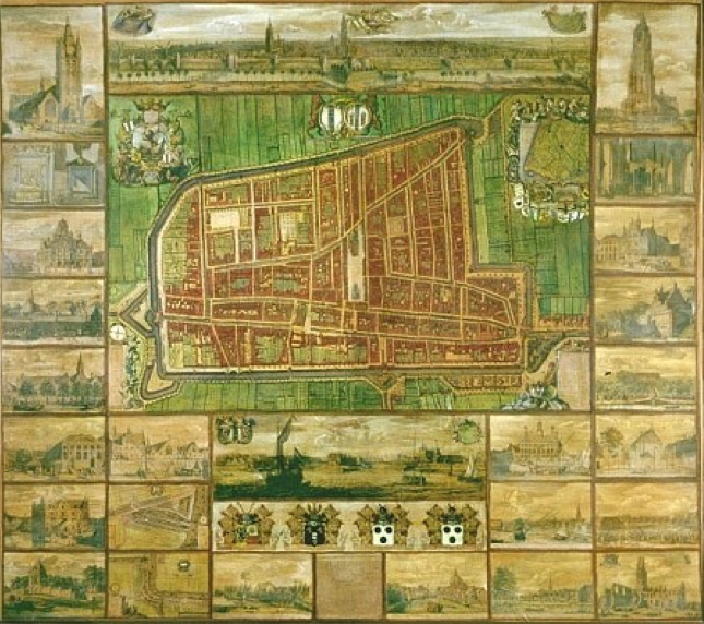 The northeast (top left) quadrant of Bleyswick's Kaart Figuratief, first published in 1678. |