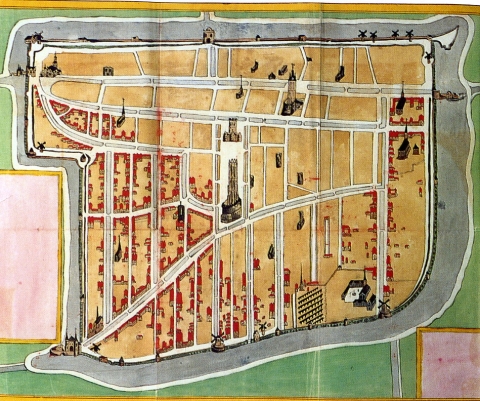 1556Jacob van Deventer (Kampen, c. 1500/1505 - Cologne, 1575) made this map of Delft as one of his series of over 250 maps of cities and towns in the Spanish Netherlands, commissioned for military purposes by King Philip II. For those purposes, it would have paid special attention to the points of access to the city. Both the Rotterdamse/Schiedamse gates and the Haag/Wateringse gates at either end of the Oude Delft gracht are clearly double and parallel gates. There are no ramparts at the top left corner near the Haagpoort nor in front of the Waterslootse Poort. |