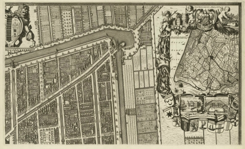 The northwest (bottom left) quadrant of Bleyswick's Kaart Figuratief, first published in 1678. |