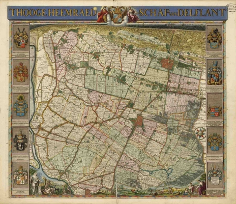 The polders around Delft in Leeuwenhoek's time, now housing the bulk of Delft's almost hundred thousand citizens. On the map, the straight black lines are raised dikes between the drained fields. The land in South Holland had been managed for centuries, since 1289, by the Hoogheemraadschap van Delfland. This water control board managed the water barriers (dikes), the waterways (canals), the water levels, and the water quality. It did not manage the water supply for human use. Along with the other ancient water boards, the oldest forms of local government in the Netherlands, the Hoogheemraadschap set the stage for the decentralized Dutch Republic's astounding success in its Golden Age.