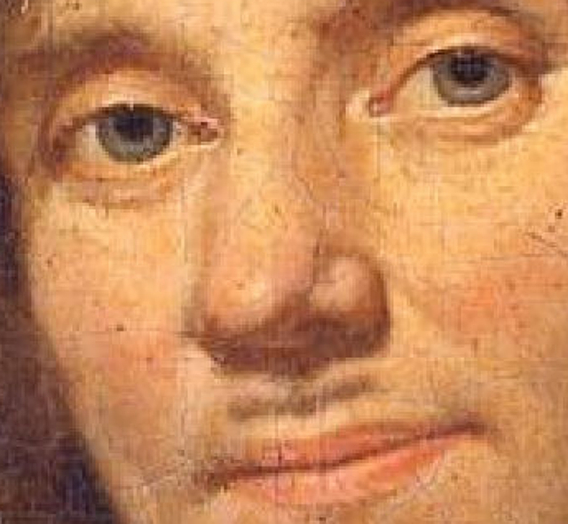 Close-up detail of portrait of Antony van Leeuwenhoek by Johannes Verkolje in (probably) 1686, at age 54, oil. Dobell p. 346 dates it 1686 because of its similarities to Verkolje's mezzotint, which is dated 1686. Check out that little moustache! |