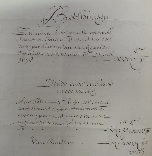 The table below shows the Reekening's headings and major subheadings that had totals and sub-totals. Some of them are very long and list the sub-subheadings; they have been shortened (though not re-worded or re-spelled) for this table. These section headings in the account books remained almost identical for years 1658 through 1681. The revenue/expense total of 630,060 guilders for 1678 was closer to the more common 400-500,000 guilders than to the excesses of 1674 and 1675 after the Rampjaar, when it was almost triple that level, peaking at a little over 1.1 million guilders in 1675.