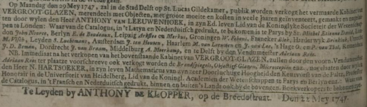 Op Maandag den 29 Mey 1747 zal in de Stad Delft op St. Lucas Gildekamer publik worden verkogt het vermaarde Kabinet van Vergroot-Glazen, meerer lees: met objecten, met groote moeite en kosten in veele jaaren inverteert gemaakt en nagelaaten door wijlen den Heer Anthony van Leeuwenhoek, in zijn Ed. leven Lid van de Koninklijke Societeit der Wetenschappen in Landen: waarvan de Catalogus, in 't Latijn en Nederduitsch gedrukt, te bekomen is te Parijs bij Sr. Meebel Etienne David, London John Nouvee, Berlijn E. de Boudeaux, Leipzig Arbstee Merkers, Groningen W. Fabens, Franeker Blok, Harderwijk Briebink, Utrecht M. Vink, Leiden S. Suchtmans, Amsterdam J. ten Houten, Haarlem M. van Lee, 's-Hage 0 en P. van Thol, Rotterdam J.D. Bremen, Dordrecht J. van Braam, Middelburg A Meerkamp, en te Delft bij den vendumeester Adriaan Vrees.