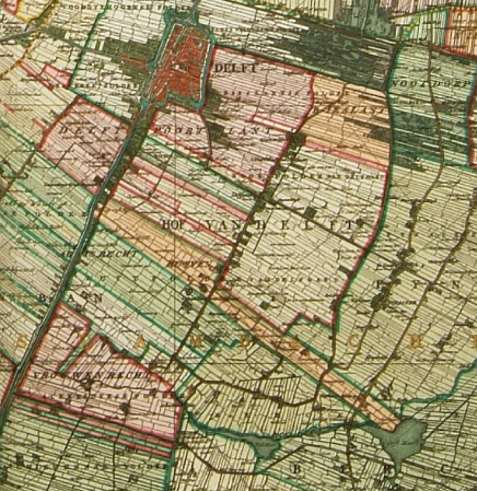 The 1712 map on the right (click to enlarge) shows Delft at the top and the two small lakes at the bottom. It is a detail from the wallmap Het Hoogeheemraedschap van Delflant by Nicolaes Krukius (1678-1754), also Nicolaas (Klaas) Kruik or the Latinized Nicolaus Samuelis Cruquius. At the time, mapmakers did not practice the convention of north at top. The Schie canal runs south out of Delft toward Rotterdam. In the bottom left corner of the map is the hamlet of Zweth. There, the Berklse Zweth runs east straight between the polders to the two lakes.