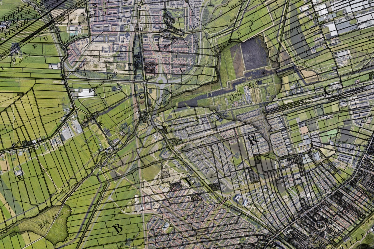 By the mid-1700's, the peat was rapidly disappearing, so the lakes were drained to provide arable land. The map below places the Krukius map as a layer over a Google Earth screenshot. It was made by Wim van Egmond, a microphotographer who lives in Berkel on what was the shore of the old Oostmeer.