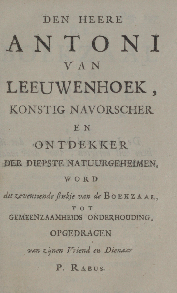 Rabus dedicated the issue of March and April 1695 to Leeuwenhoek (right): "To Mr Antoni van Leeuwenhoek, artful researcher and discoverer of the deepest secrets of nature, this 17th piece of the Boekzaal is dedicated to the maintenance of familiarity of his friend and servant P. Rabus."