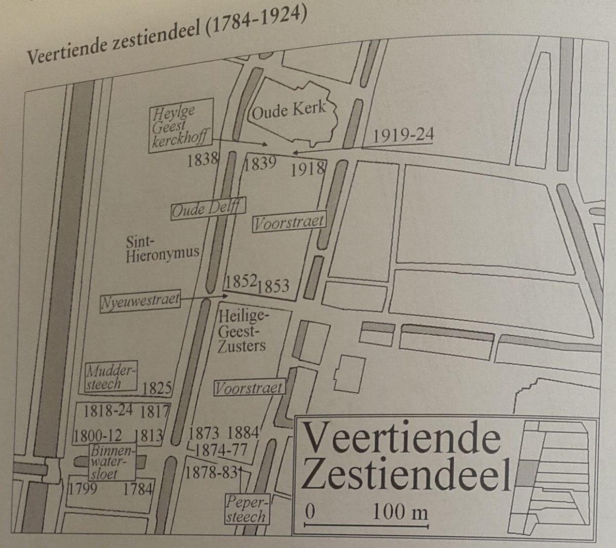 For administrative purposes such as the Familiegeld (estate tax) in 1674, the city was divided into 16 districts. These districts were established for the tiende penning (tenth penny, tithe) tax in 1543. The map below right from Gerrit Verhoeven's Het eerste kohier shows Leeuwenhoek's district, the 14th. His house was in the center, just to the right of the 3 in 1853. The inset map of the whole city shows the sixteen districts, numbered clockwise from the top right. An extension of the 16th in the northwest corner of the city included the Buitenwatersloot. Another two districts lay outside the walls to the southeast.