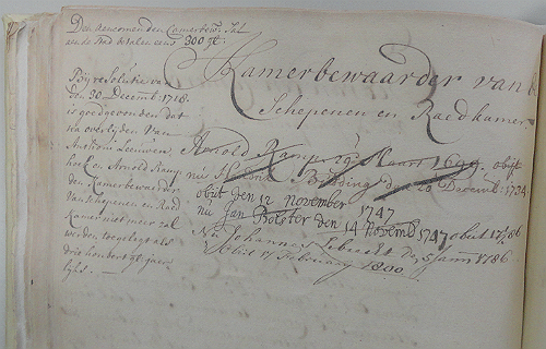Resolutie ter verbetering van Stads- finantie, d.d. 30 December 1718 Dat na overlijden van Antony Leeuwenhoek en Arnold Ramp, de kamerbewaarder van Schepenen-kamer voortaan niet meer sal toegelegt worden als ƒ 300 |
