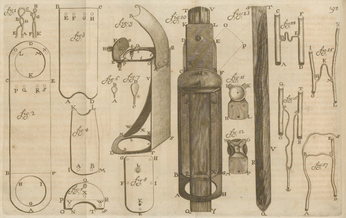 In January 1689, Leeuwenhoek wrote another letter to the Royal Society describint the eel viewer and its construction. All of the figures for that letter were on one plate, below.