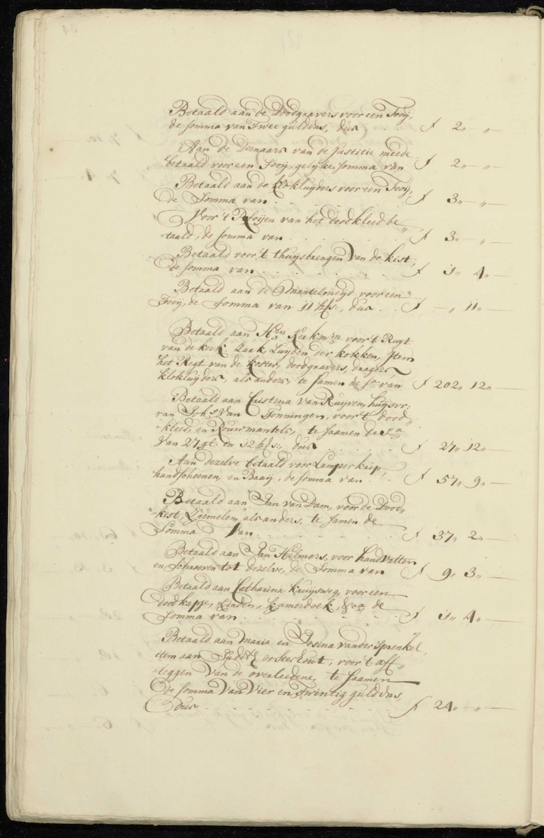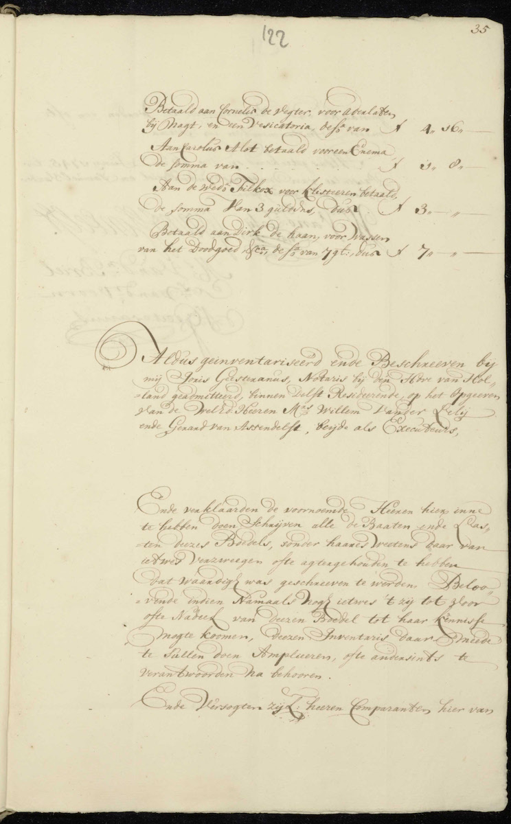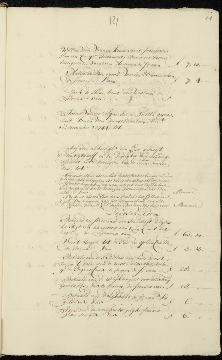 The final few pages (33v - 35 on the right sidebar; click to enlarge) list the liabilities: claims on the estate (lasten deze boedels) and the costs associated with Maria's burial and the adjudication of her will (doodschulden). They would be paid out of the estate's cash before distribution to her heirs.