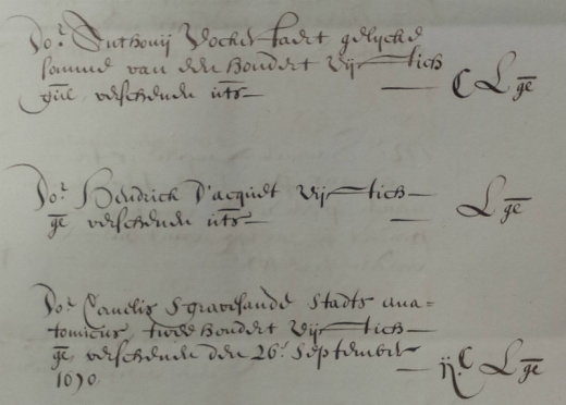 Dr. Cornelis Sgravesande stadts anatomicus, twee hondert vijftich gl,