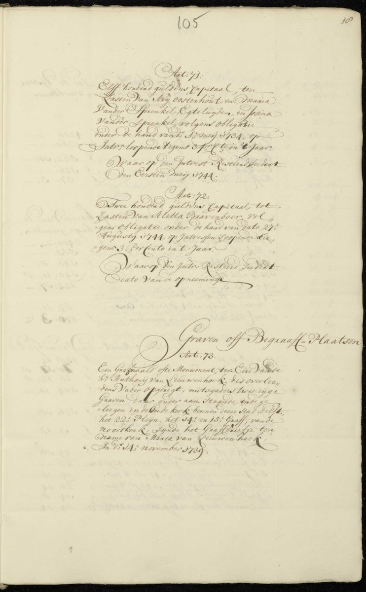 Maria's time and tax-bracket peer group whose inventories were analyzed in Achter de Gevels van Delft (chapter 4) owned more land than she did. About a third of them owned land outside of the city and about half of them owned gardens. Almost all of them owned the house they lived in. Eleven, Maria among them, owned a total of 36 rental properties. They owned 35 church graves and 2 even owned crypts (grafkelders). These numbers would not include Leeuwenhoek's obelisk in the Oude Kerk.