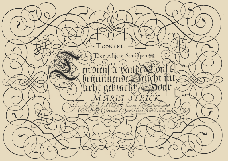 Four copybooks and three prints have survived as examples of her calligraphy (image below; click to enlarge). They were engraved by her husband Hans.