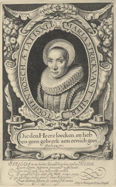 Jan's grandmother was Maria Strick (right in 1618 by Willem Jacobs Delff; click to enlarge), who was born Maria Becq in 1577 in 's-Hertogenbosch. Her father moved to Delft when she was a teenager and started a French and German school on the Oude Delft (now number 79). In 1598, she married the shoemaker Hans (Jan) Strick. After her father died, she opened a school of calligraphy. She and her husband and children lived in Rotterdam after 1615, where they were active in the Lutheran community.