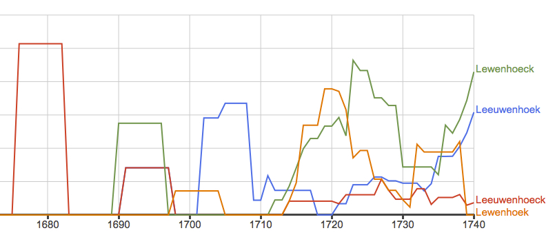 The Google Ngram chart below illustrates this situation by showing the relative frequency of only four different spellings of Leeuwenhoek's name in English publications during his lifetime.