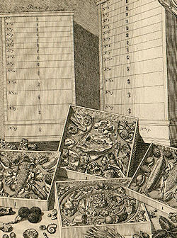 The Dutch called the collected things rariteiten, rarities, strange things, curiosities. The image below right is Levinus Vincent's Wondertooneel der Nature (Wonder Theater of Nature), 1715.