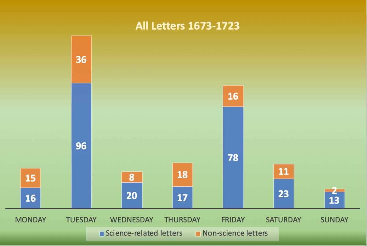The 285 letters with scientific observations. The other 79 were cover letters, query letters, thank-you letters (for example, for his election to the Royal Society), dedications, and copies of letters. See chart below.