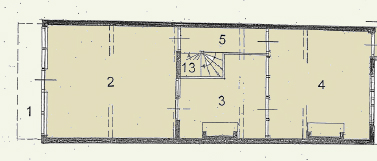 From the stoop (#1), the entrance to the house was in the center with a window to each side. On the back wall of the front room (#2) were a door to the hallway (#5) and a door to the inner room (#3). The hallway had a landing for the stairs. Both the hallway and the inner room had doors leading to the back room (#4), which had a window looking onto the courtyard. In the corner, a door led to the gallery (see Lower floor back).