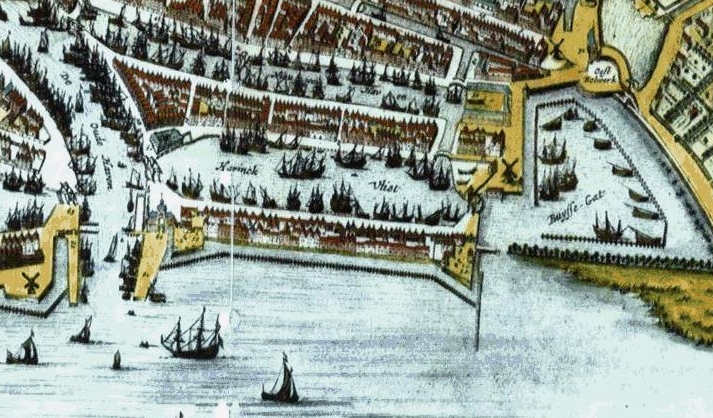 The admiralty in Rotteram was established in 1574 for equipping warships that would protect overseas trade and well as ships that would patrol traffic on the sea and rivers, collecting taxes and confiscated property (aka loot). In 1644, the Admiralty moved to the north-west corner of Haringvliet (right; click to enlarge), a site demolished in the 1800's.