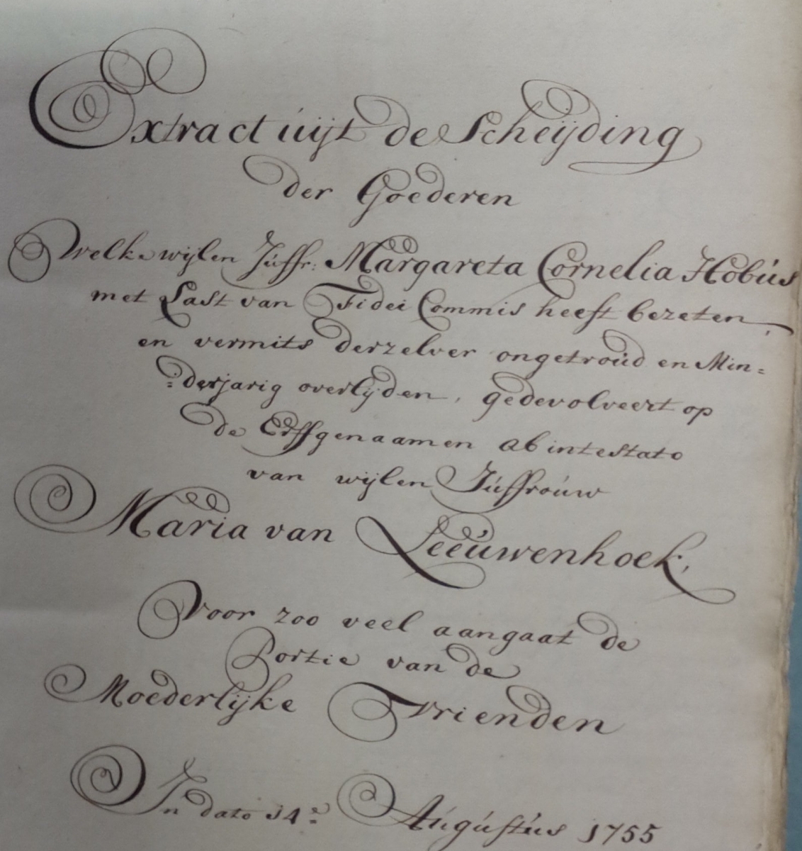 Extract from the division of goods which the late Miss Margareta Cornelia Hobus with (the order?) of the Fidei Commis has possessed and since the same died unmarried and underage, transfered? on the estate of Miss Maria van Leeuwenhoek ab intestato.