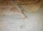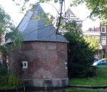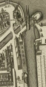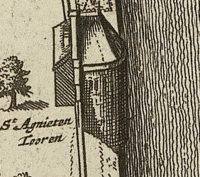 On early maps, the tower appears as a bastion that juts into the singel, as did the other towers on the southern and western sections of the singel. By the time Leeuwenhoek rented it, it was enclosed and had a pointed roof, according to the Kaart Figuratief (detail top right; click to enlarge; north is left). The tower was at one end of a garden that ran east along the singel toward the city's Oostpoort. At the other end of the garden, about 75 yards (68 meters) away, was Paul Durven's family home on Oosteinde.