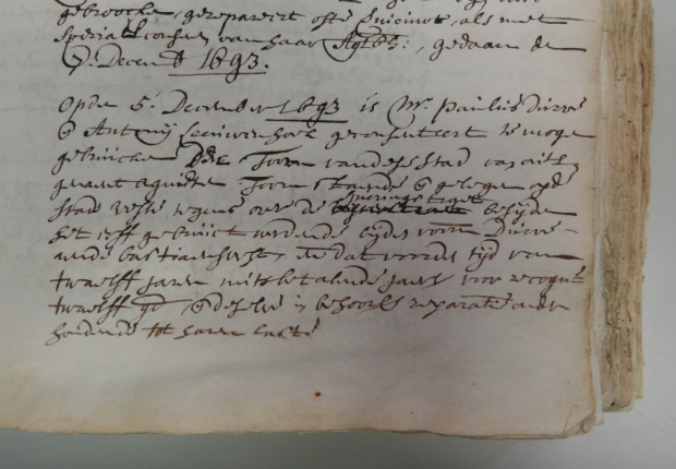 It begins, Op den 5 December 1693 is Mr. Paulus Durven and Antonij Leeuwenhoek ... . The third-to-last line begins twaalf jaren, twelve years. The second-to-last line begins twaalf gd, twelve guilders.