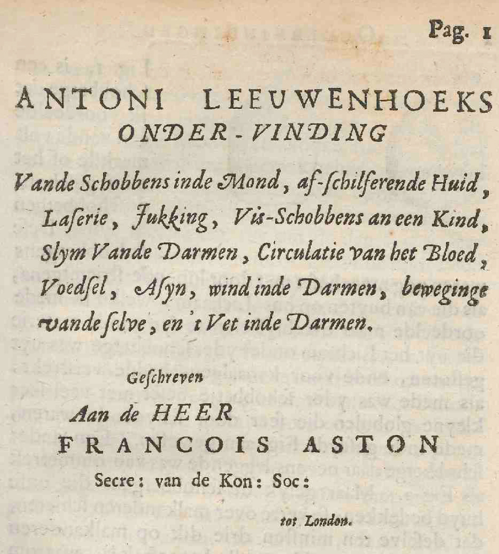 The earlier printing has a separate title page and a two-page preface from the printer to the reader. The later has no title page. At the top of page 1 (click to enlarge, move, and resize), the words "Antoni Leeuwenhoeks Onder-Vinding" are replaced with "Antoni van Leeuwenhoeks 40ste Missive." and the other two parts are reversed. It is the "van" that makes me consider it a later printing.