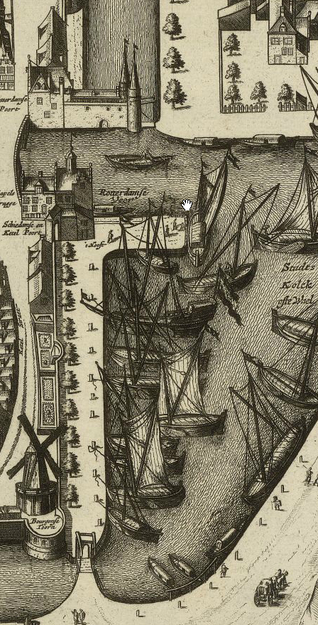 The Schiedamse Poort, also known as the Kethelpoort, was on the Kolk across the Capels Brugge (Chapel Bridge) from the Rotterdamse Poort.