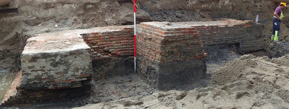 The Schoolpoort was the first of Delft's medieval gates to be demolished. About a hundred years after Leeuwenhoek's death, it was too dilapidated to be worth repairing, so the city council decided to tear it down in April 1829. The photo below of its foundation comes from the current project in the area, the Spoorzone. Learn more about archeology in the Spoorzone: images and video.