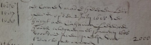 As shown on the image below (click to enlarge) of a section of page 21v of the tax-farmers manual, on July 2, 1685, the mayors met and gave Catarina a three-year term, effective January 1686, for collecting the excise tax on auctioned buildings (boelhuijsen). Also, her payment rose from 1,700 to 2,000 guilders annually; there's no way to tell whether there was a cause-effect relationship between these two events.
