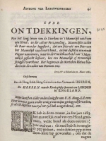 These two letters were paginated continuously, not separately. That is, Letter 44 ends on page 39 and Letter 45 begins on page 41 of Sout-figuren even though it had nothing to do with salt crystals. However, Letter 43 began Leeuwenhoek's investigation of salt crystals and was written just two weeks before Letter 44 in January 1685. It would have made more sense to package Letter 43 and Letter 44 together under the title of Sout-figuren. They were both printed by Boutesteyn in 1685. Nevertheless, Letter 43 was printed as the final letter in Onsigtbare verborgentheden, also continuously paginated, where it began on page 51.