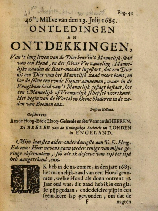Letter 45 of March 30, 1685 (AB 84), about his discovery of sperm in a dog's uterus, with 6 figures.