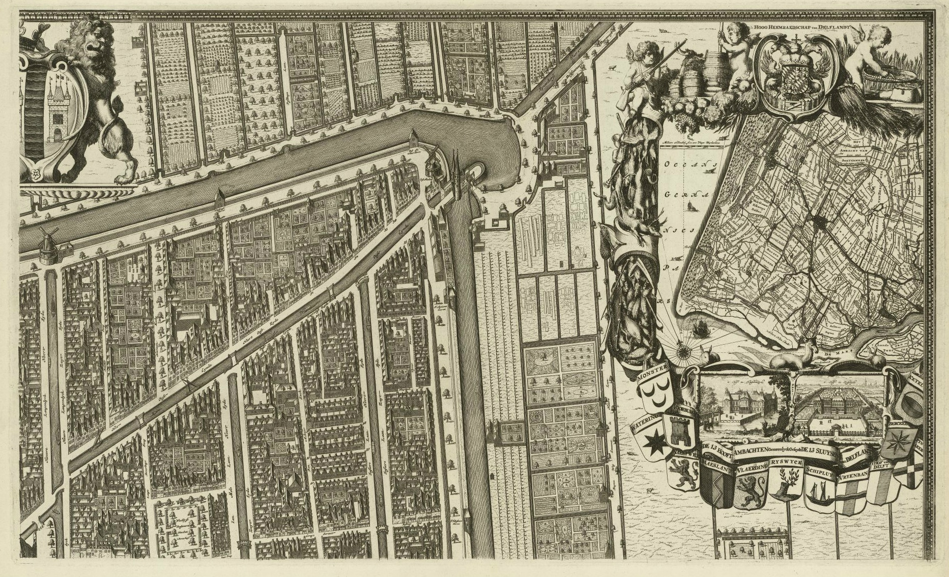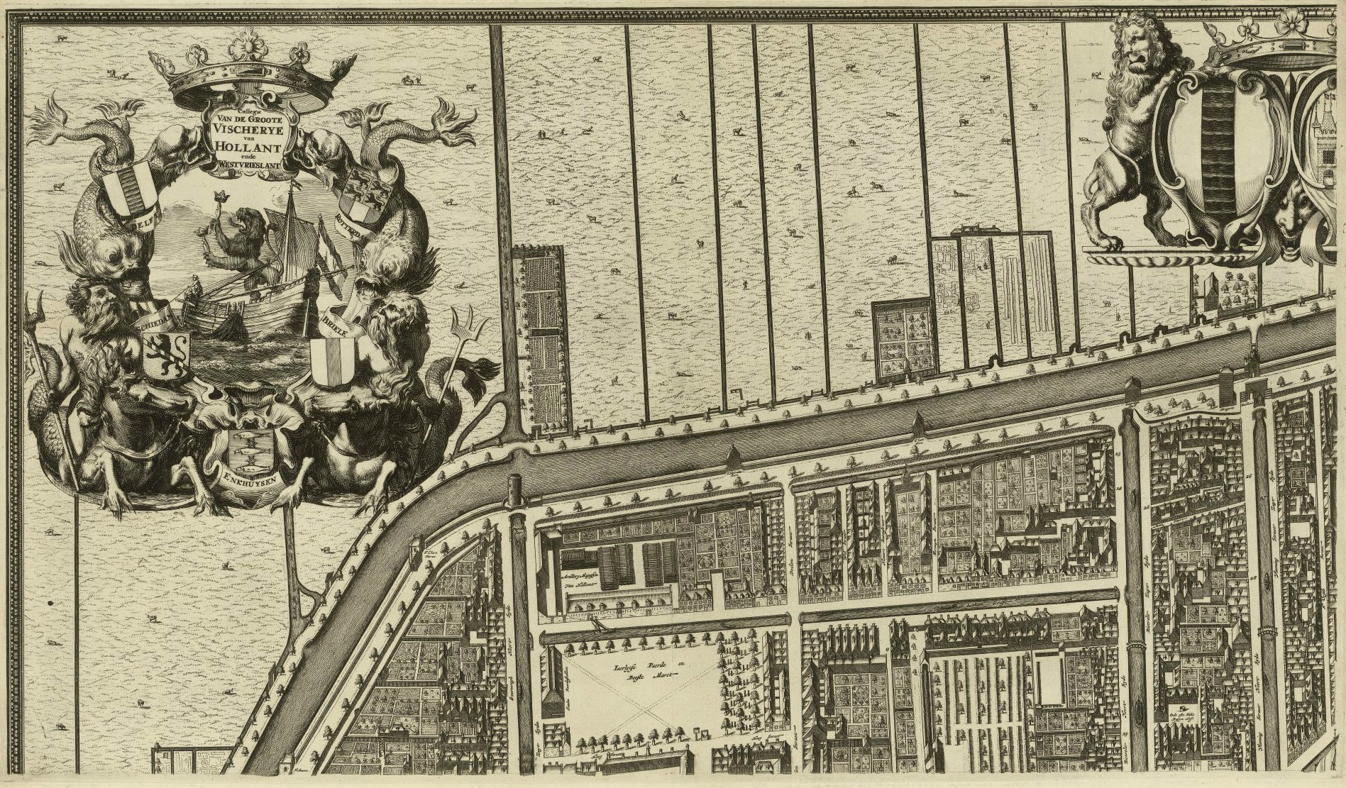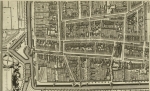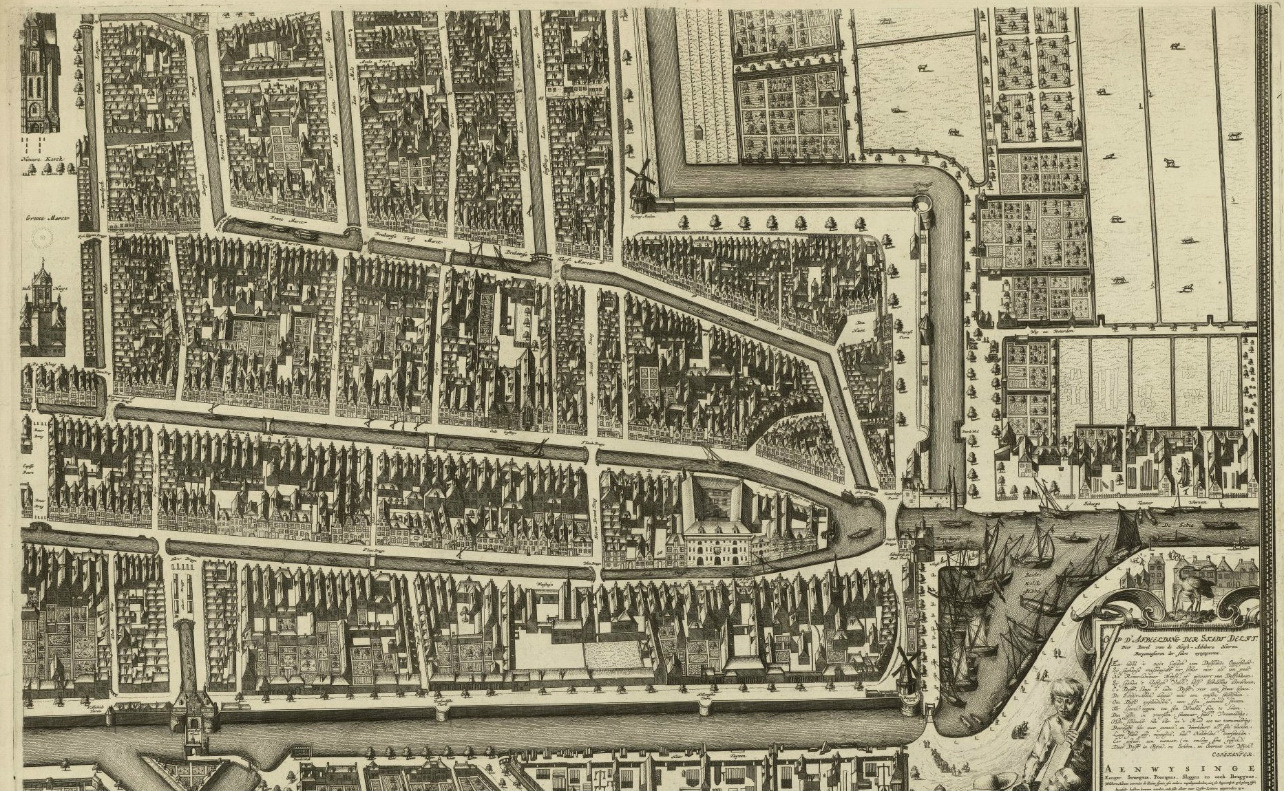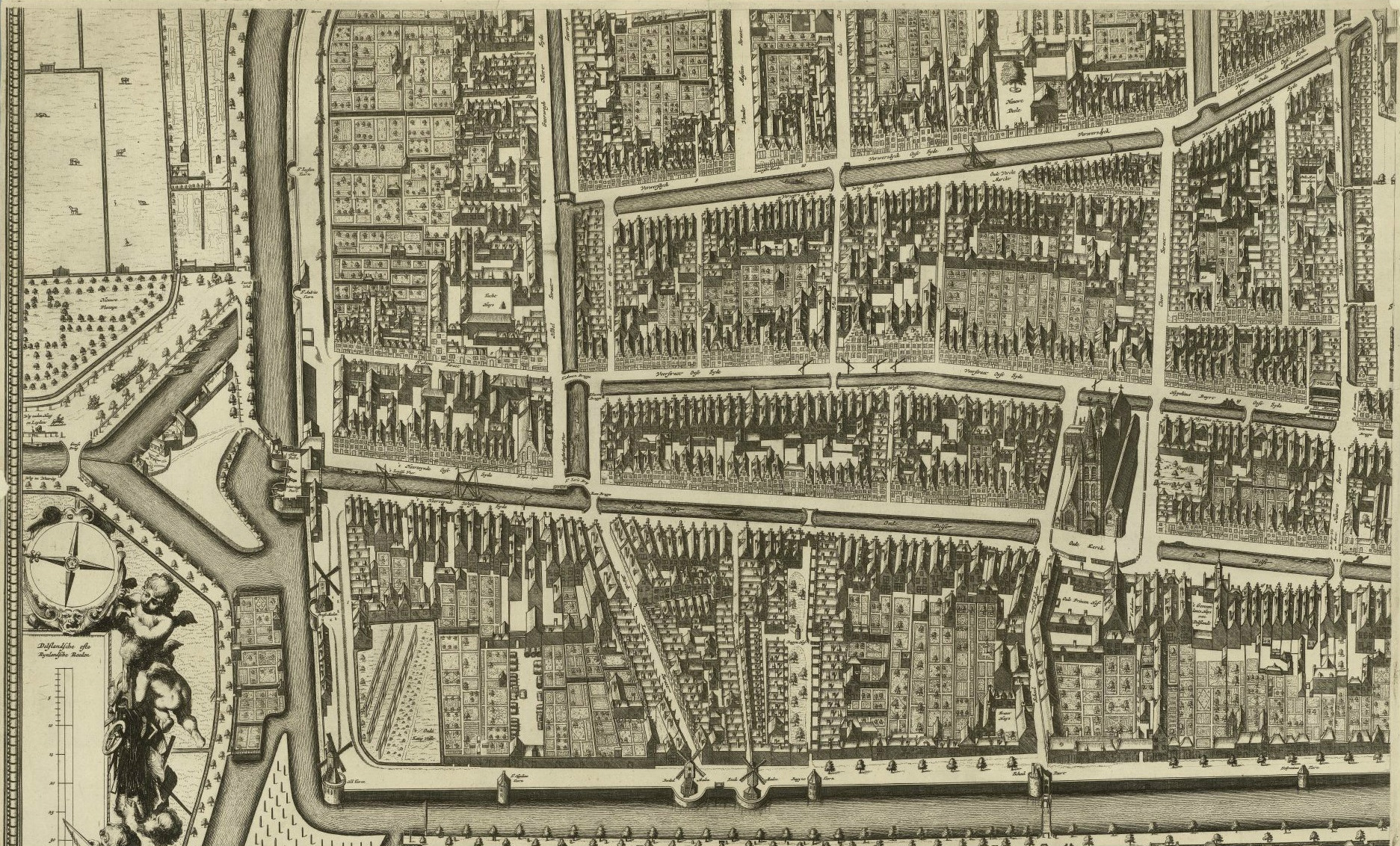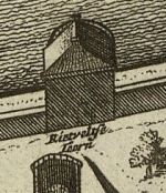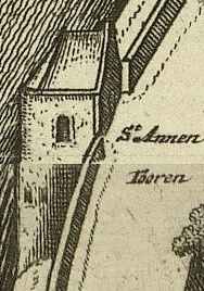 On all the maps, these three round towers look the same. On the Kaart Figuratief, they are square buildings flush with the city wall. The round part, more a hemisphere or half-tower, jutted from the wall over the little ledge into the singel. Two of the three towers survive; the Rietveltse Toren was recently renovated.