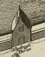 These two seem to be of the same design as the ones on the eastern section of the singel that rise above the wall enough for a window and enough space below for another set of windows. Both of these show the door in the flat back wall flush with the city wall.