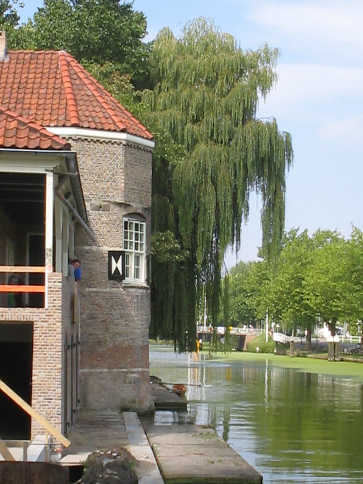 A three-story tower with roof set into an unraised, unfortified roundel perched over the end of the Geerweg gracht, also known as Kantoorgracht. All of the maps up until Blaeu's of 1649 show it as a windmill. Today's car-free Plantagebrug over the singel is a couple yards to the north. Duyvel's Gat and the Koepoortse Toorn were the only windmills built over water gates.