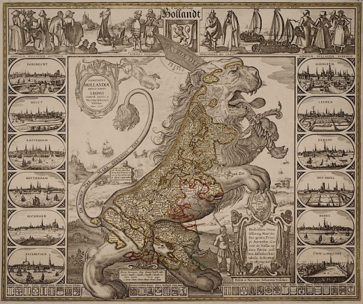 The Holland lion, shown in Leonis Hollandiae (below; click for larger size) a 1648 allegorical print by N. J. Visscher, was very expensive to keep fed. Needless to say, taxes in the Republic were high, the highest in Europe at the time.