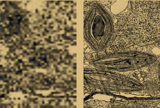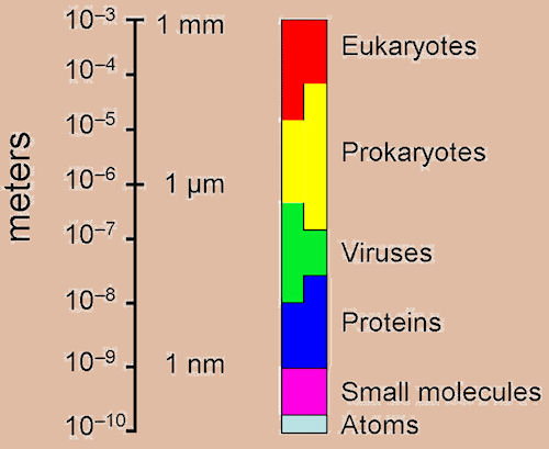 These images are identical except for resolution. The one on the left is like the eye chart; you know the letters are bigger but you can't tell a B from an E. Of Leeuwenhoek's dozen surviving lenses, nine were measured by J. van Zuylen in the early 1980's. Their resolving power range from 1.16 to 4 microns. In other words, it will clearly show structures that small, the yellow area in the chart above. |