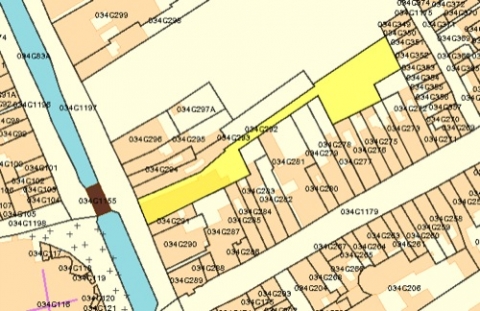 east side very large property across the gracht behind Oude Kerk w/ long narrow passage between two parts (pasouth sideage to garden?)