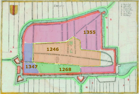 The light brown area was the only area originally granted city rights by Count Willem II. It had the three orgininal grachten, now called the Oude Delft, Niuewe Delft, and the Brabantse Turftmarkt, Burgwal, and Verwersdijk.