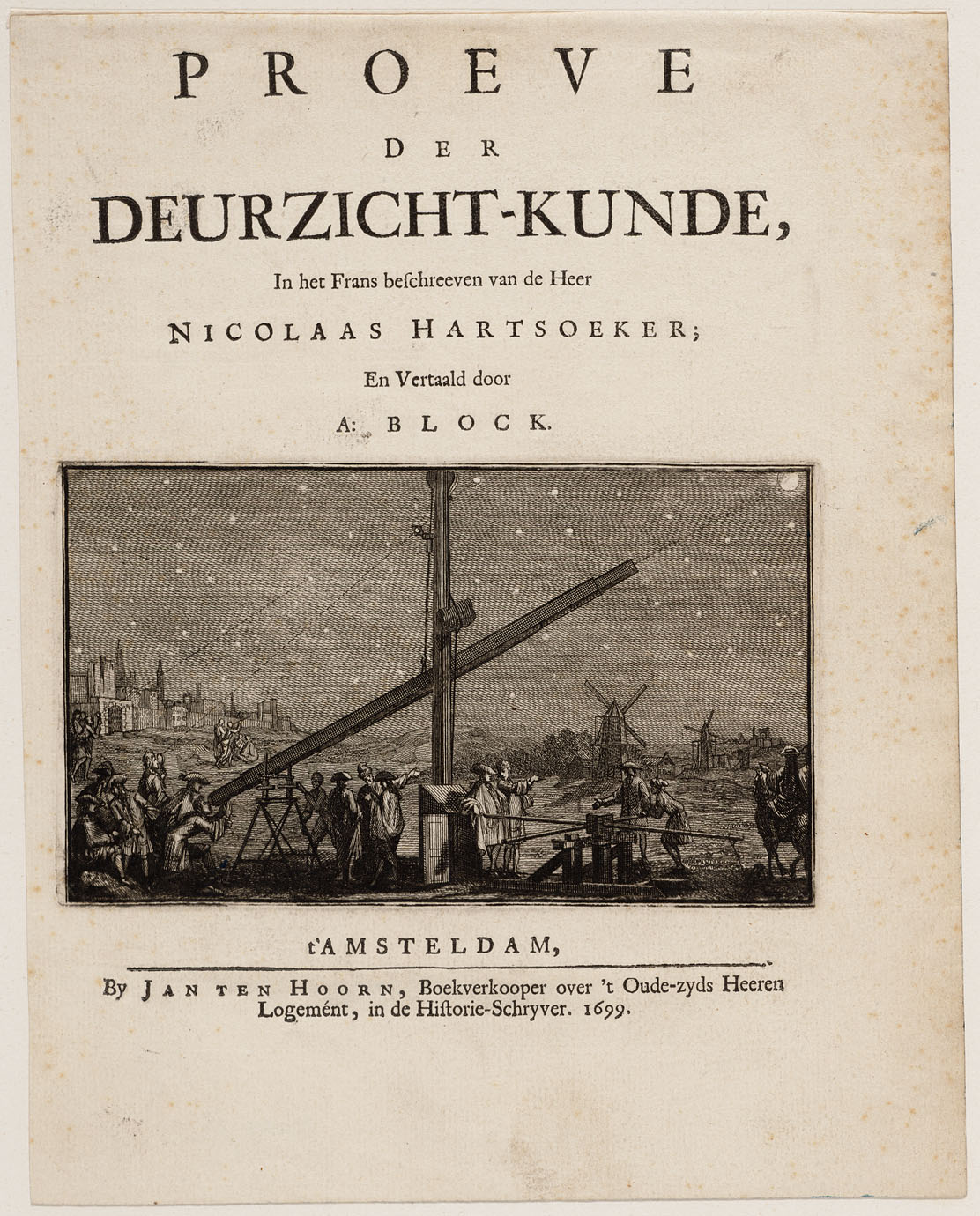 What triggered Leeuwenhoek's reaction was his reading a pre-publication copy of Hartsoeker's Proeve der Deurzicht-kunde, the Dutch translation by A. Block of Hartsoeker's Essai de dioptrique from 1694. Jan Luykens did the cover illustration, which did not appear in the French version. It shows one of Hartsoeker's designs for a long telescope. Earlier Christiaan Huygens had been influenced by Hartsoeker's designs for his own long telescope.