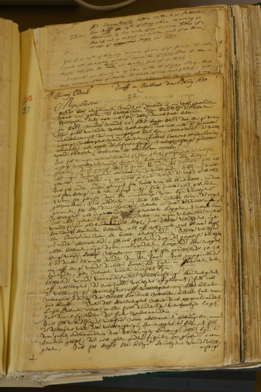 The smaller piece of paper labeled 22a has the title of the letter as it appeared in Philosophical Transactions no. 136 and the beginning of the English translation.
