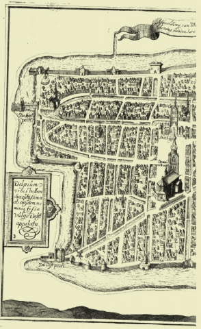 1648Delft in border print from Leonis Hollandiae by Visscher, published in 1648 |
