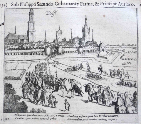 1622Willem Baudaert's (Baudartius 1565-1640) Polemographia Auraico Belgica was published in 1622 by Michael Colinius in Amsterdam. It described conditions at the beginning of the 80 Years War in the late 1500's and included this view of Delft. It was derived from an image by Frans Hogenberg. It is not very accurate. Among other things, if the gate in the middle is the Wateringsloot Poort, then the churches' relative positions should be reversed.