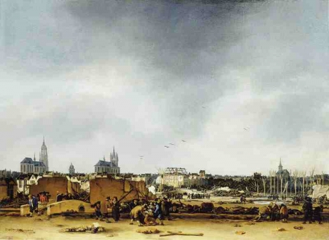 1615Oil on panel by Hendrik Cornelis Vroom (1562–1640). It hangs in the Stedelijk Museum Het Prinsenhof in Delft. The view is one that no one ever saw until the invention of airplanes. The Buitenwatersloot was a major route for goods and people and led to Delft's most impressive and fortified gate, the Watersloot Poort. On the far right is the newly dug Kolk, the triangular-shaped harbor in front of the Schiedamse Poort. The Schie went off in that direction, south, toward Rotterdam, Delftshaven, and Schiedam. Some of Leeuwenhoek's relatives owned property farther along the Buitenwatersloot, just out of the painting's frame, probably as gardens. |
