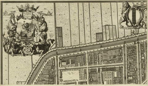 The northwest (bottom left) quadrant of Bleyswick's Kaart Figuratief, first published in 1678. |