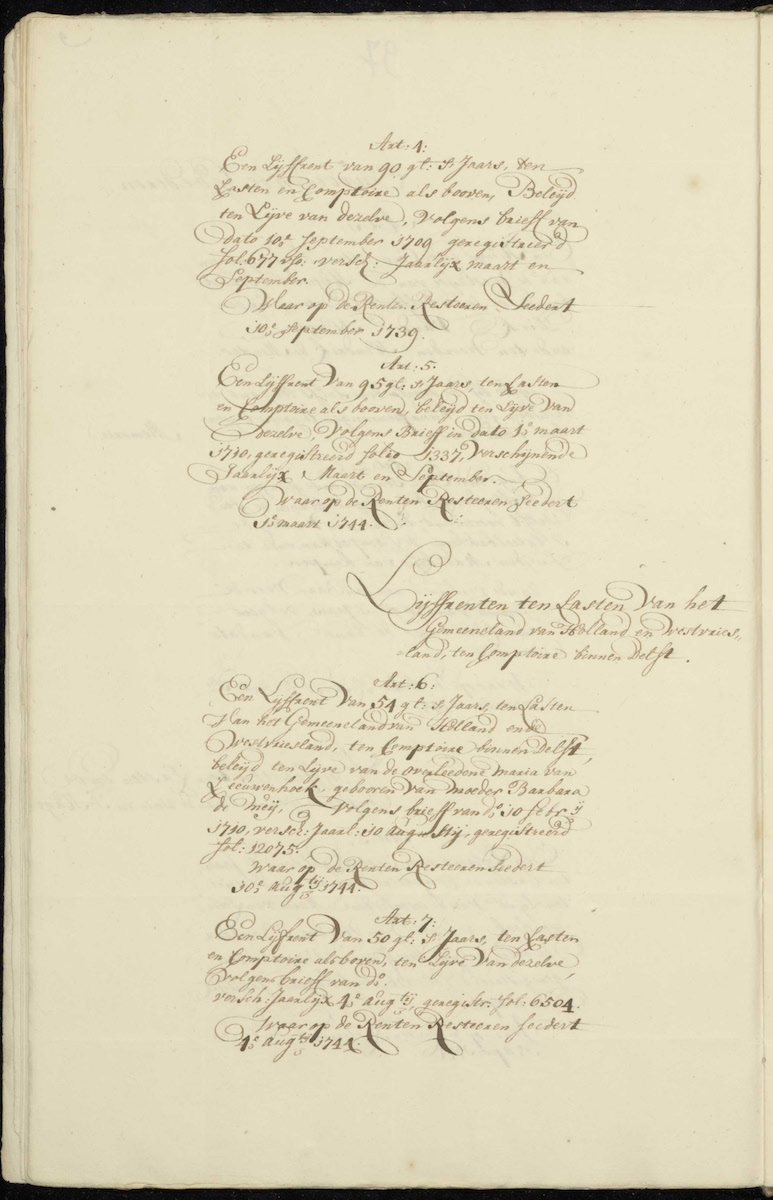 - The annuity in article 7 (right, click to enlarge) is not dated in the original. It appears in the section titled: Life annuities --- of the province's Delft office (Geemeneland van Holland en Westvriesland, ten comptoire binnen Delft).